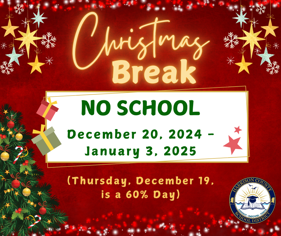 Schools in the Harrison County School District will be closed for the Christmas Break from Friday, December 20, 2024, through Friday, January 3, 2025!